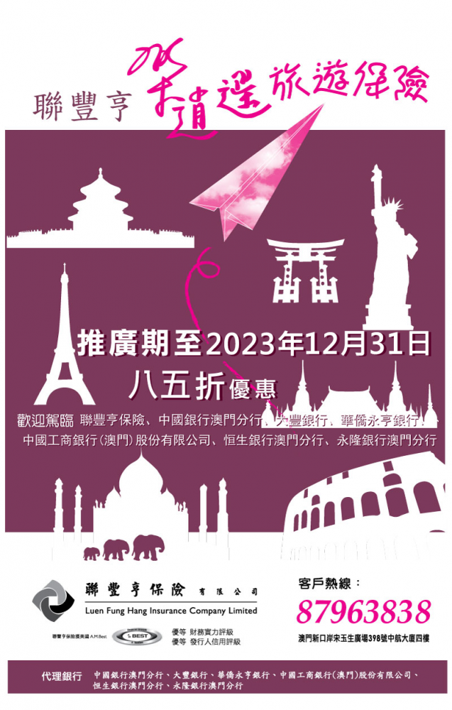 聯豐亨保險與您共享歡樂,樂逍遙旅遊保險八五折優惠,回饋新老客戶。推廣期:由2023年6月11日至2023年12月31日投保旅程: 2023年6月18日至2023年12月31日 歡迎駕臨各代理銀行或本公司查詢!